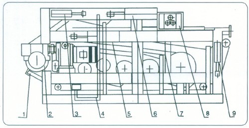 其中:1、刮泥系統(tǒng);2、傳動(dòng)系統(tǒng);3、上糾偏系統(tǒng);4、沖洗系統(tǒng);5、下張緊系統(tǒng);6、上張緊系統(tǒng);7、急??刂?;8、氣控箱;