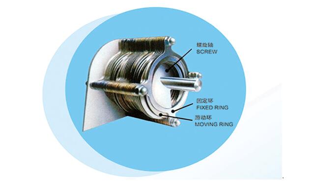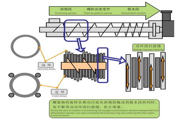 3、自清洗:螺旋軸的旋轉(zhuǎn),推動游動環(huán)不斷轉(zhuǎn)動,設(shè)備依靠固定環(huán)和游動環(huán)之間的移動實現(xiàn)連續(xù)的自清洗過程,從而巧妙地避免了傳統(tǒng)脫水機(jī)普遍存在的堵塞問題。