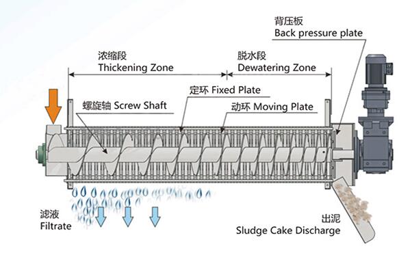 2、脫水:經(jīng)過濃縮的污泥隨著螺旋軸的轉(zhuǎn)動不斷往前移動;沿泥餅出口方向,螺旋軸的螺距逐漸變小,環(huán)與環(huán)之間的間隙也逐漸變小,螺旋腔的體積不斷收縮;在出口處背壓板的作用下,內(nèi)壓逐漸增強(qiáng),在螺旋推動軸依次連續(xù)運(yùn)轉(zhuǎn)推動下,污泥中的水分受擠壓排出,濾餅含固量不斷升高,最終實現(xiàn)污泥的連續(xù)脫水。